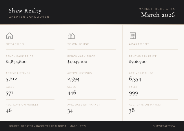 Data sourced from the Greater Vancouver Realtors MLS Home Price Index, March 2026.